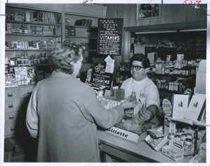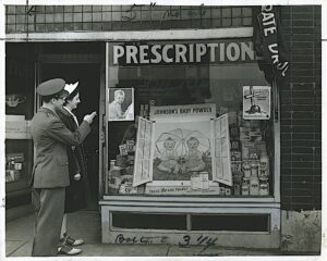 Some of the photos were taken to highlight the new mode, beginning in the 1940s, of offering customers access to products without the help of drugstore staff—the “self-serve” innovation. A lot of the photos capture new trends in promoting and displaying merchandise to increase customer interest and sales. Some of the more popular topics covered include baby products, school supplies, summer vacations, and front window displays. There are also hundreds of photos of soda fountain scenes, and of pharmacy and prescription areas showing pharmacists serving patients and customers, compounding prescriptions, or working with stock. A smaller number of photos spotlight the larger role women were starting to play in the pharmacy field, both as technicians and pharmacists.