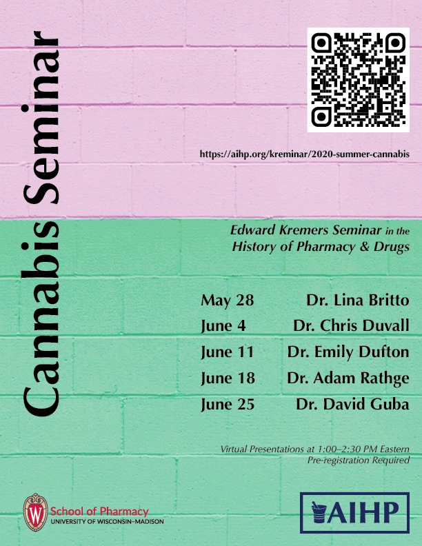 The American Institute of the History of Pharmacy and the University of Wisconsin–Madison School of Pharmacy was pleased to host the inaugural Edward Kremers Seminar in the History of Pharmacy & Drugs. The 2020 Summer “Kreminar” explored the theme of Cannabis and featured presentations and discussions by five scholars researching and writing about the history of cannabis.
